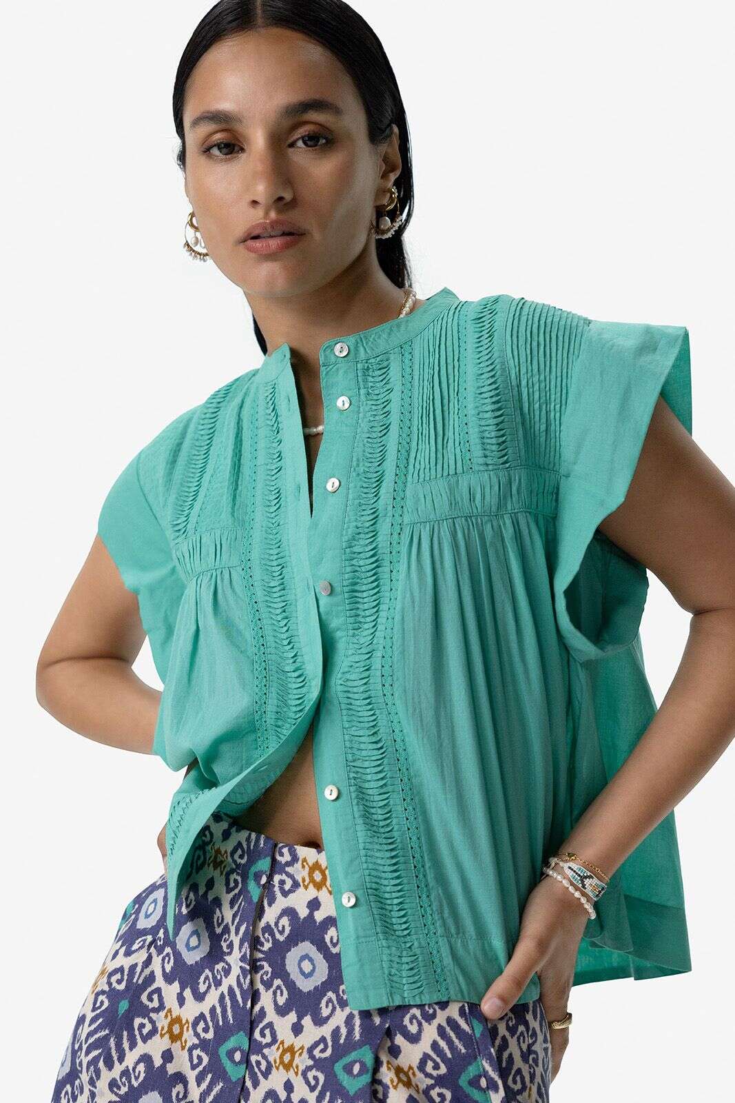 Turquoise mouwloze blouse met pintuck details