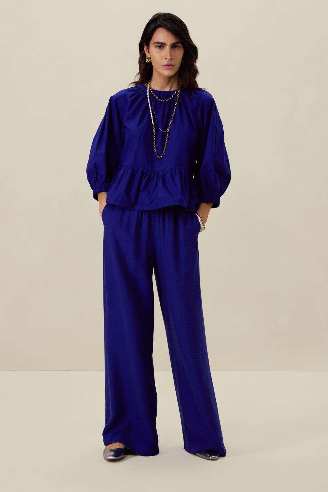 Blauwe blouse met pofmouwen