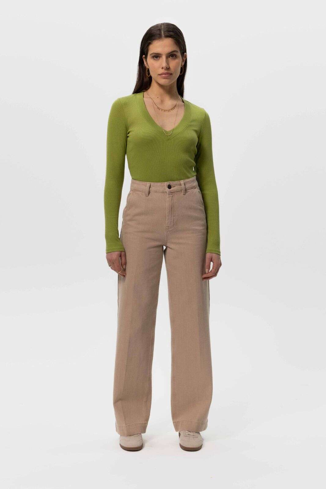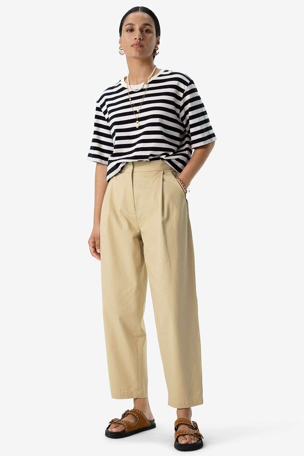 Beige mid waist katoenen bandplooibroek