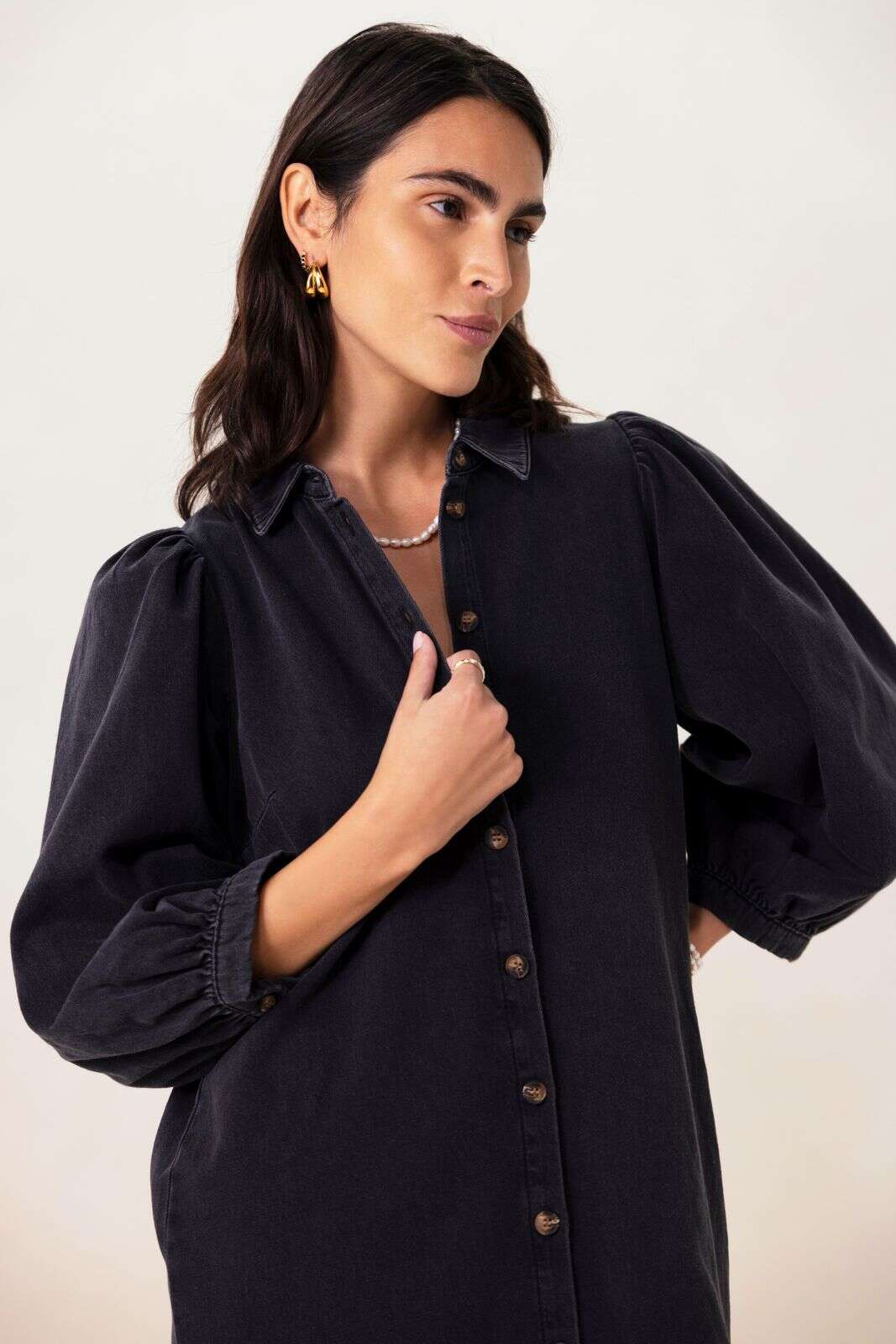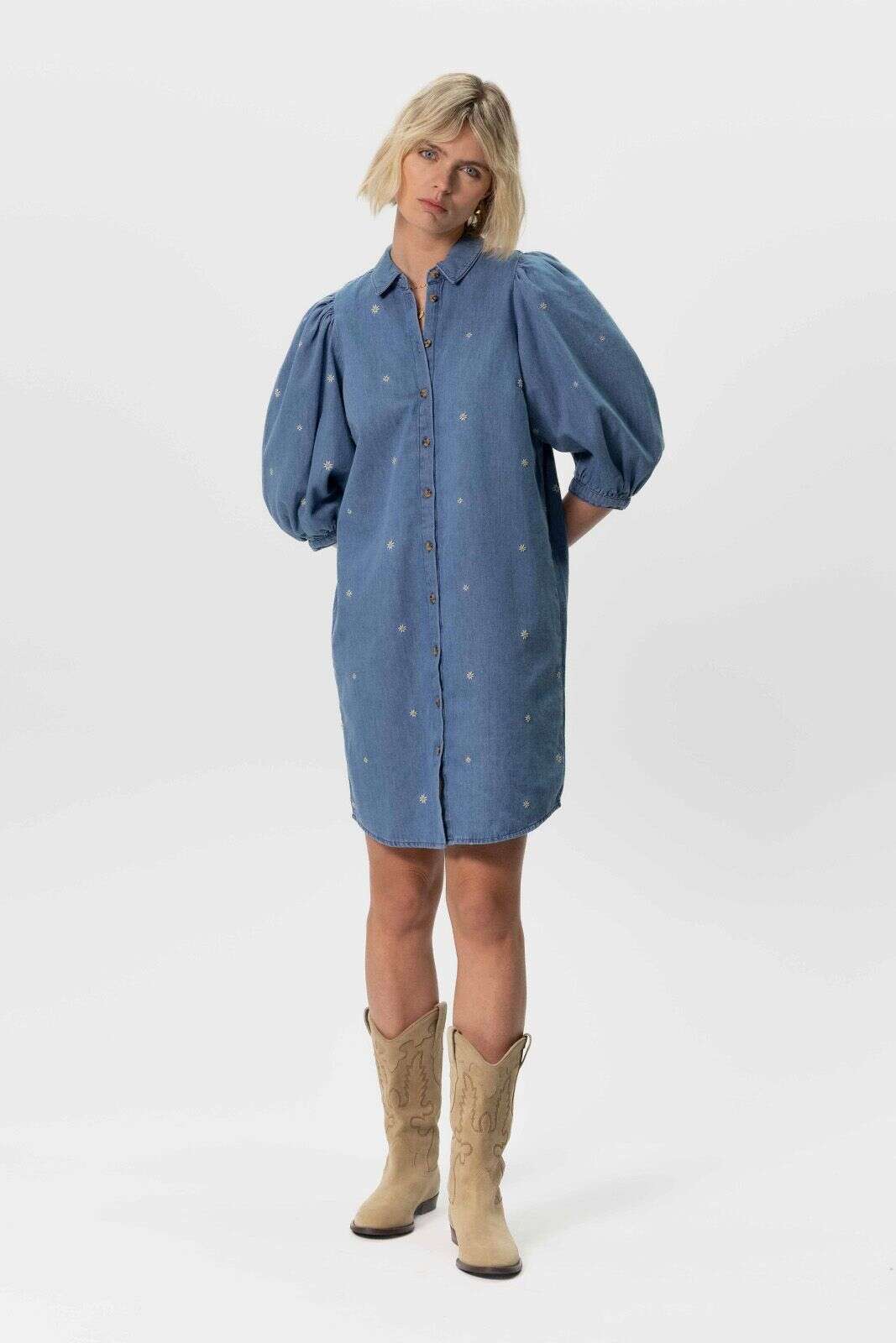 Denim jurk met pofmouwen en madeliefjes embroidery