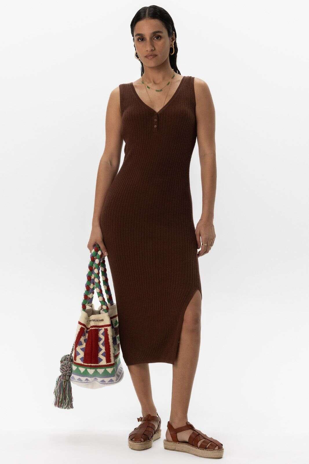 Donkerbruine fijngebreide maxi jurk met split
