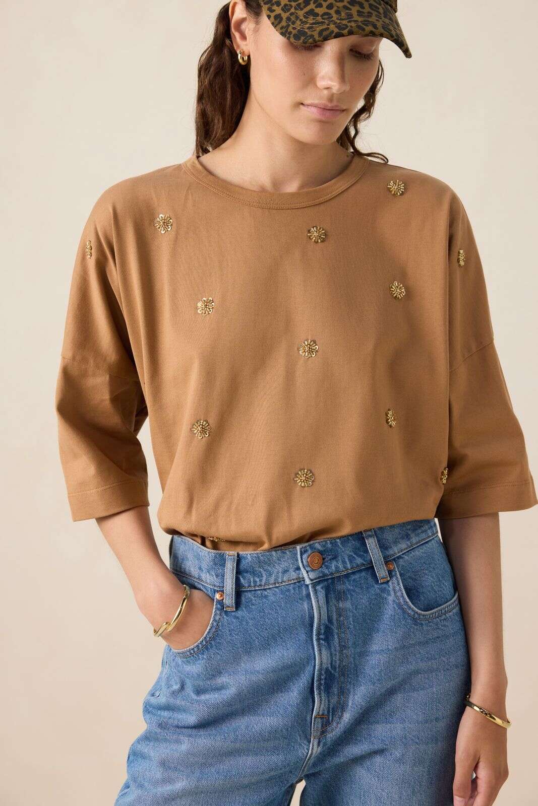Bruinjersey T-shirt met kralen