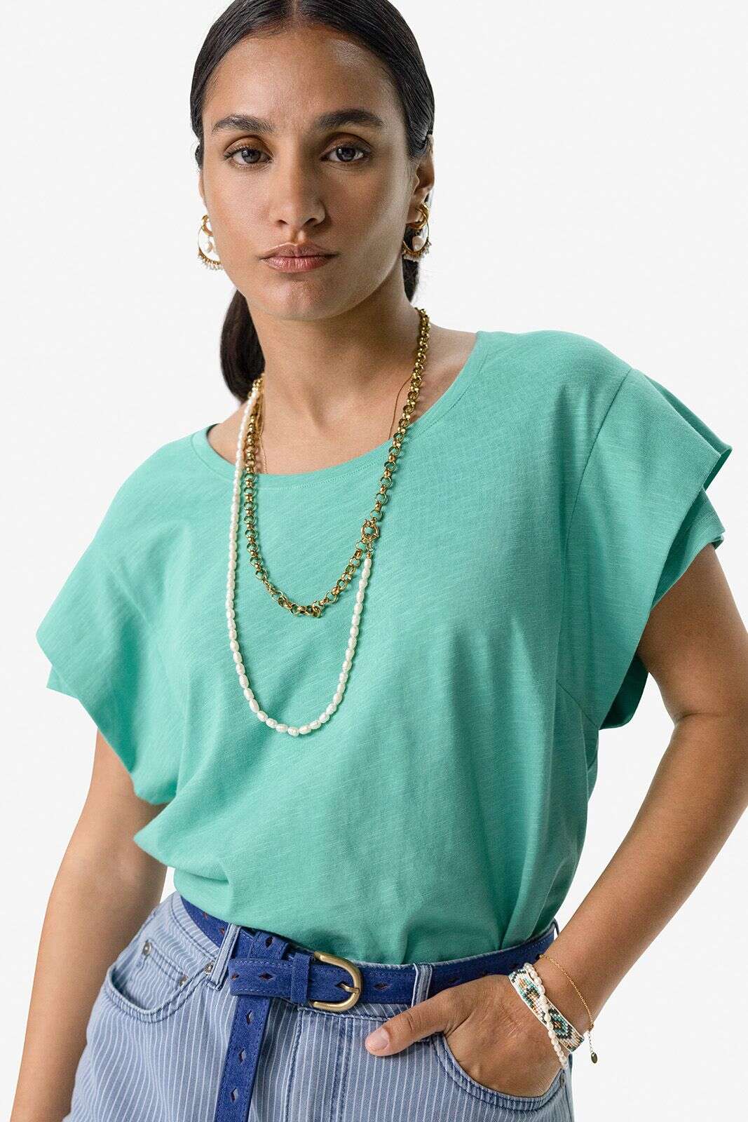 Turquoise T-shirt met schouderdetails