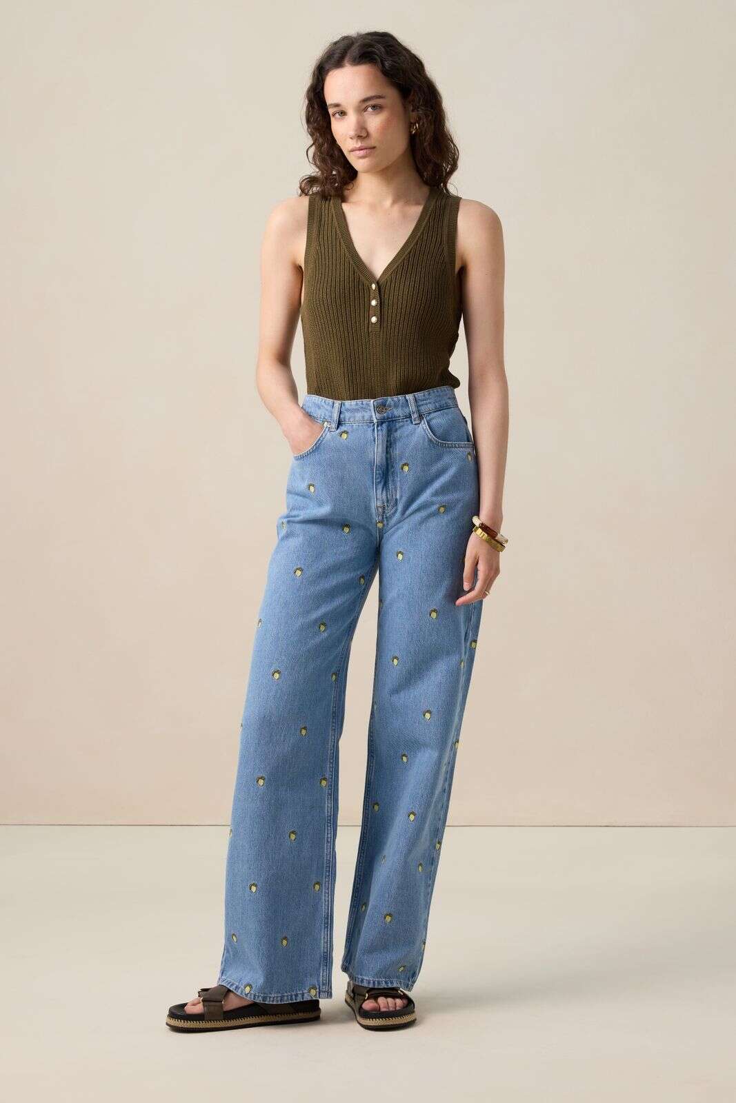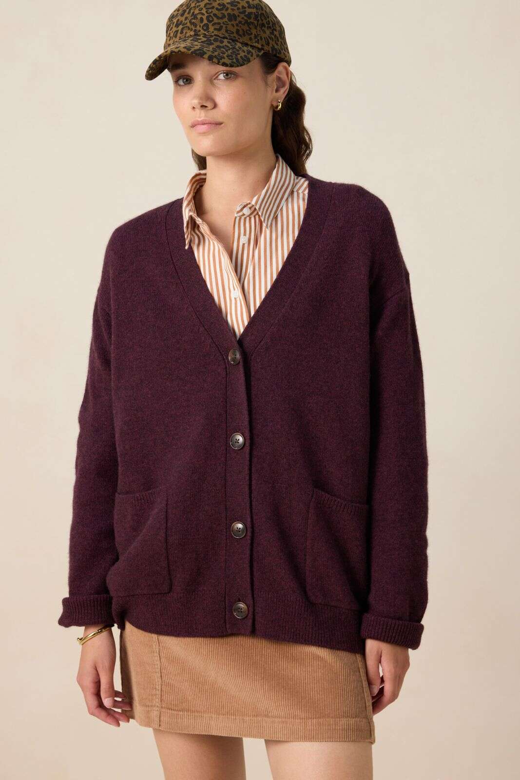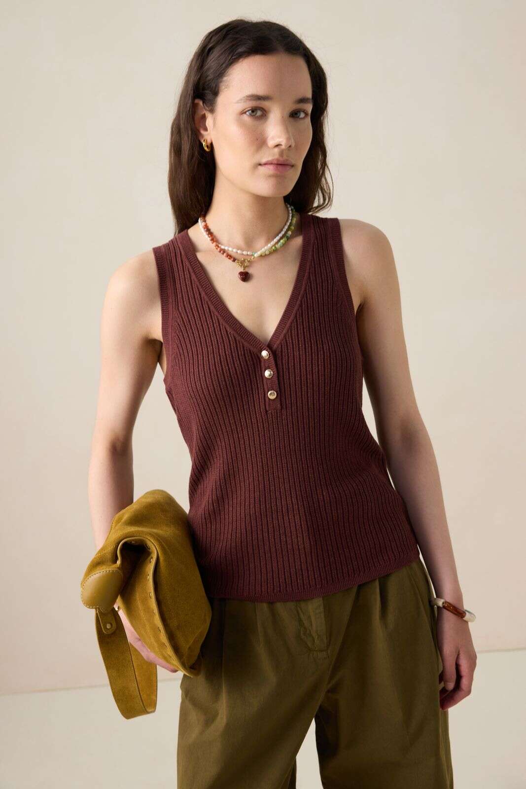 Donkerbruine trui met gouden knopen